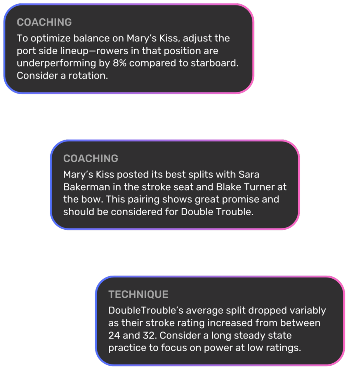 By tracking boat splits, acceleration, and shell cohesion, Atom suggests lineup adjustments that maximize speed and balance.Need to refine pairings? It highlights rowers who sync naturally. Looking for stability? It pinpoints weight distribution and power mismatches.